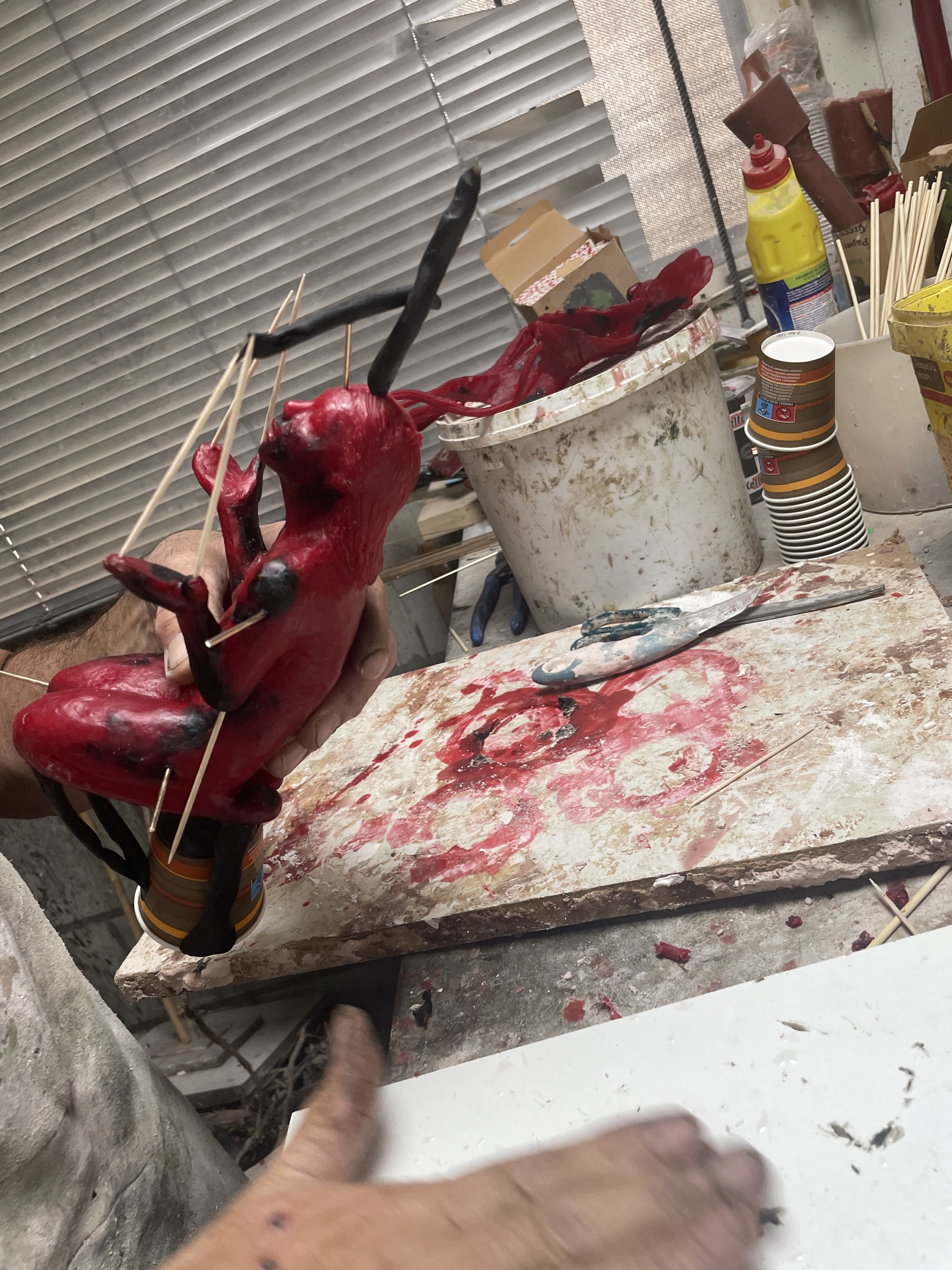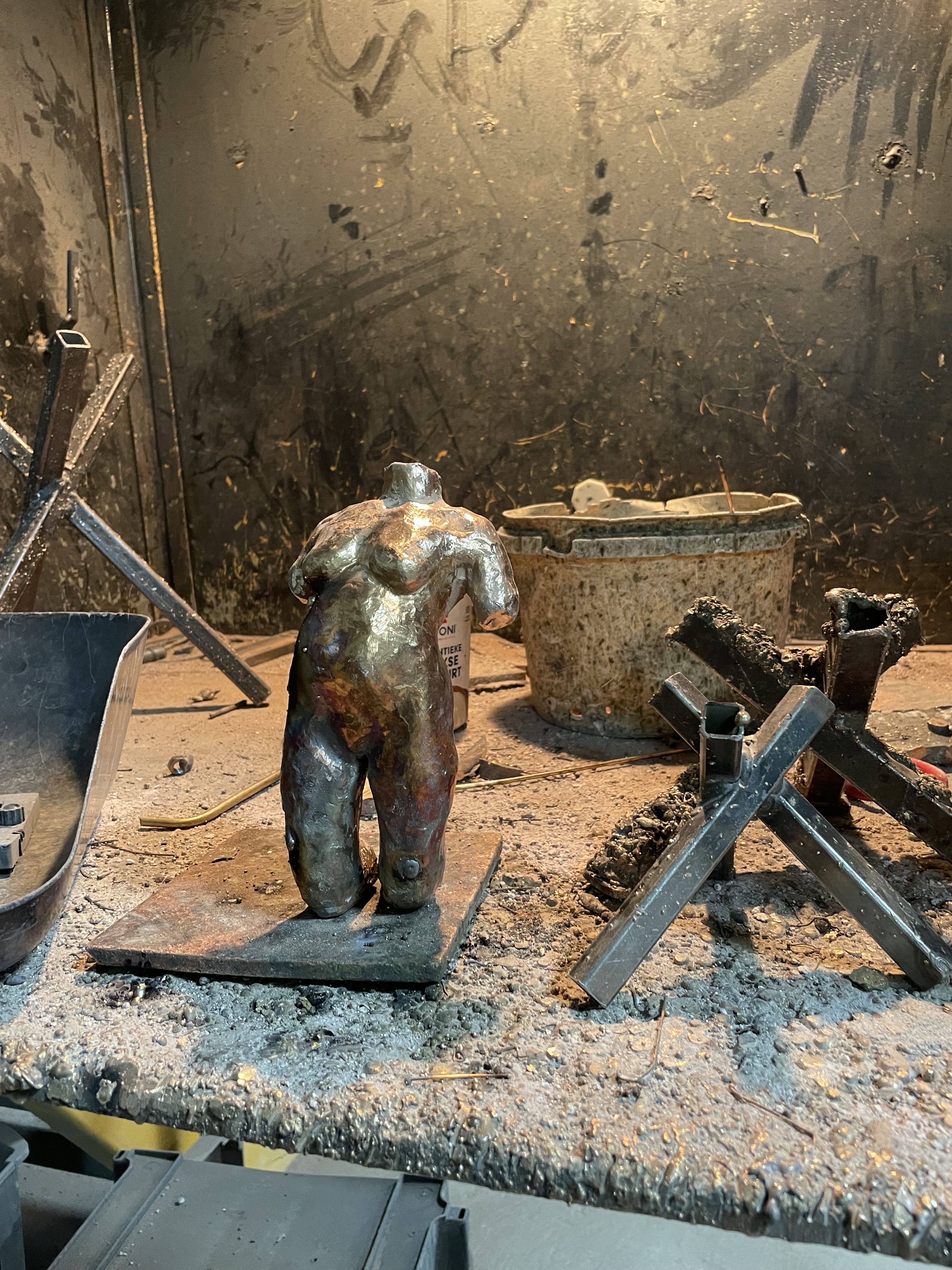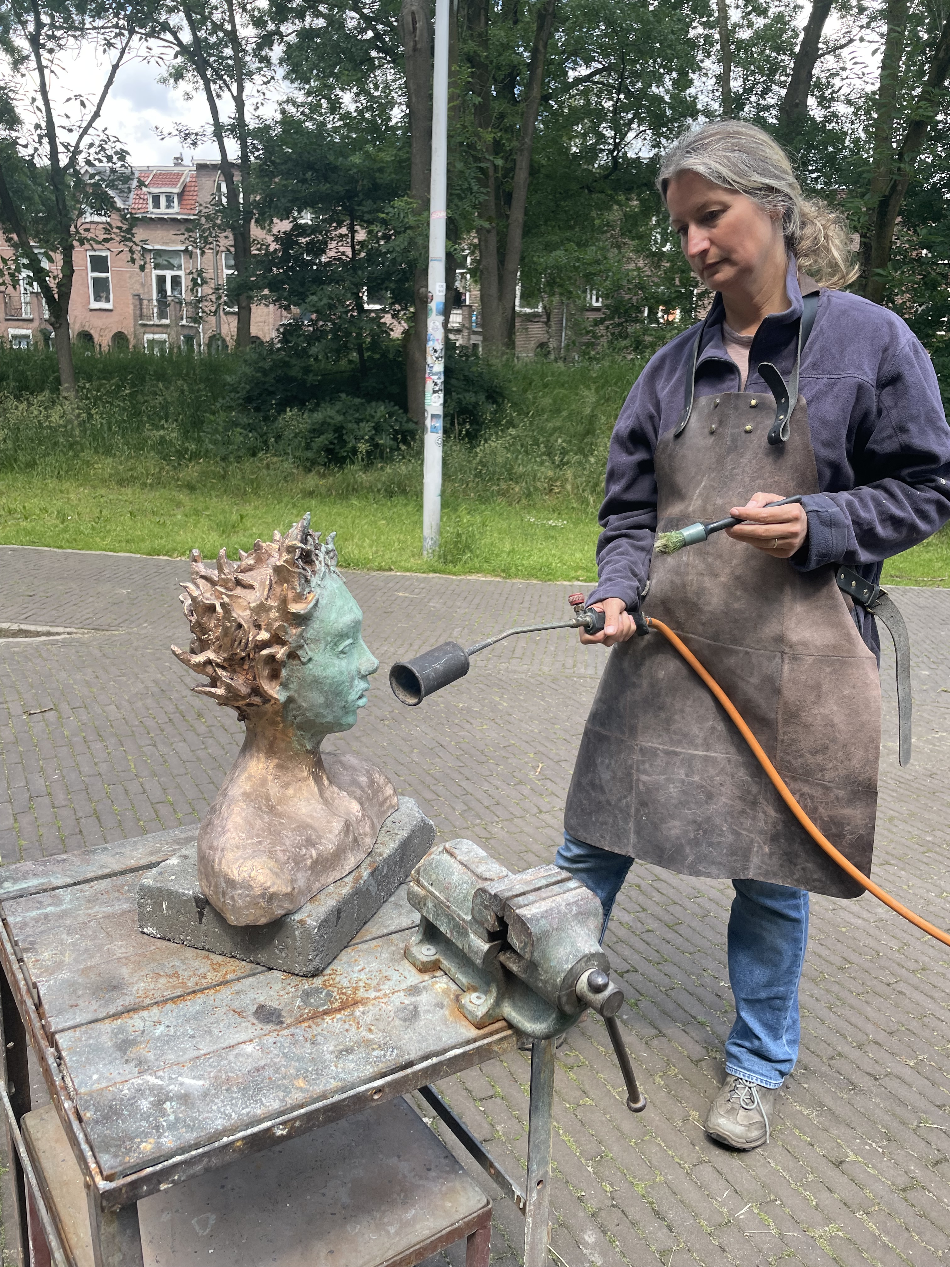 Beeld boetseren in was, mal maken van origineel in rubber, afgietsel maken in gietwas (rode kleur), gietkanalen aanbrengen, mal van gips maken, mal in de oven (verloren wasmethode), bronsgieter, afwerken, patineren, sokkel bevestigen: