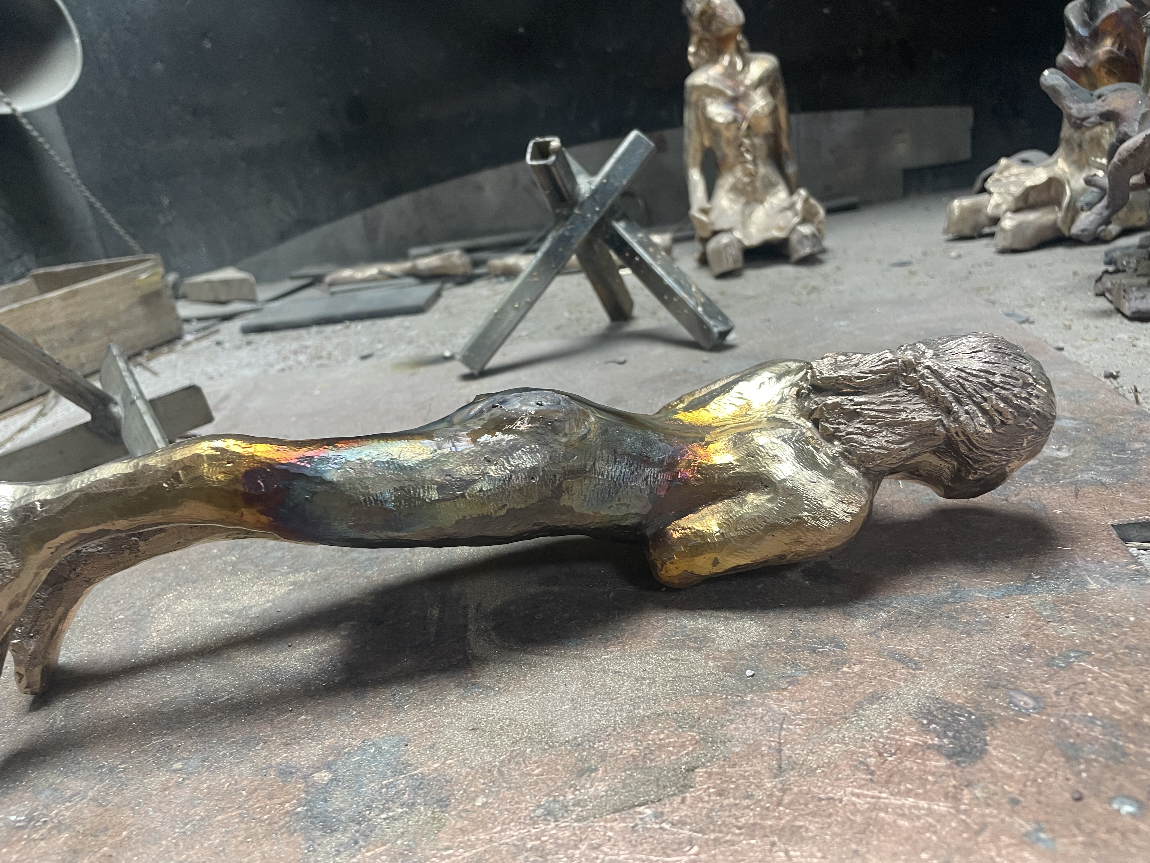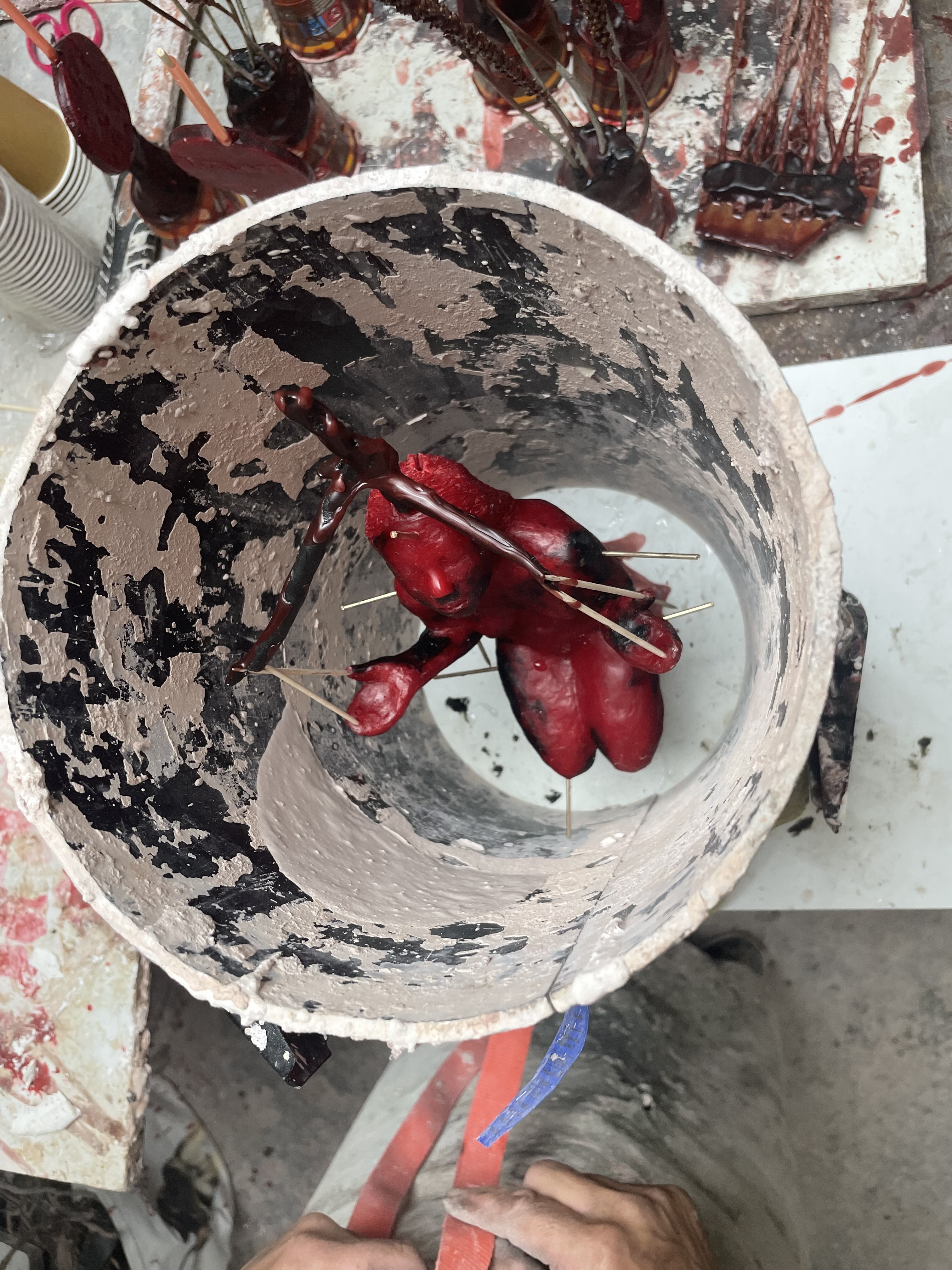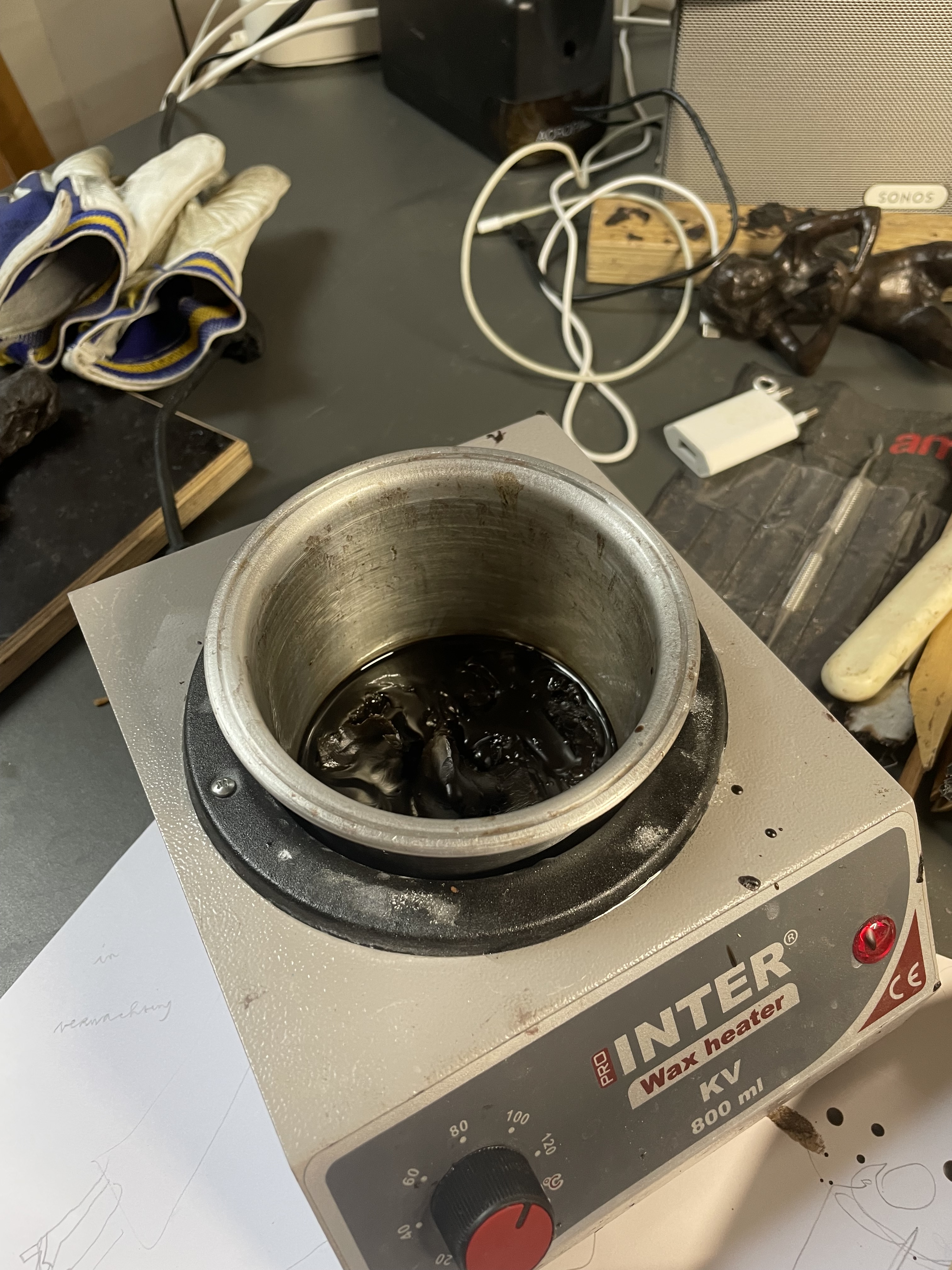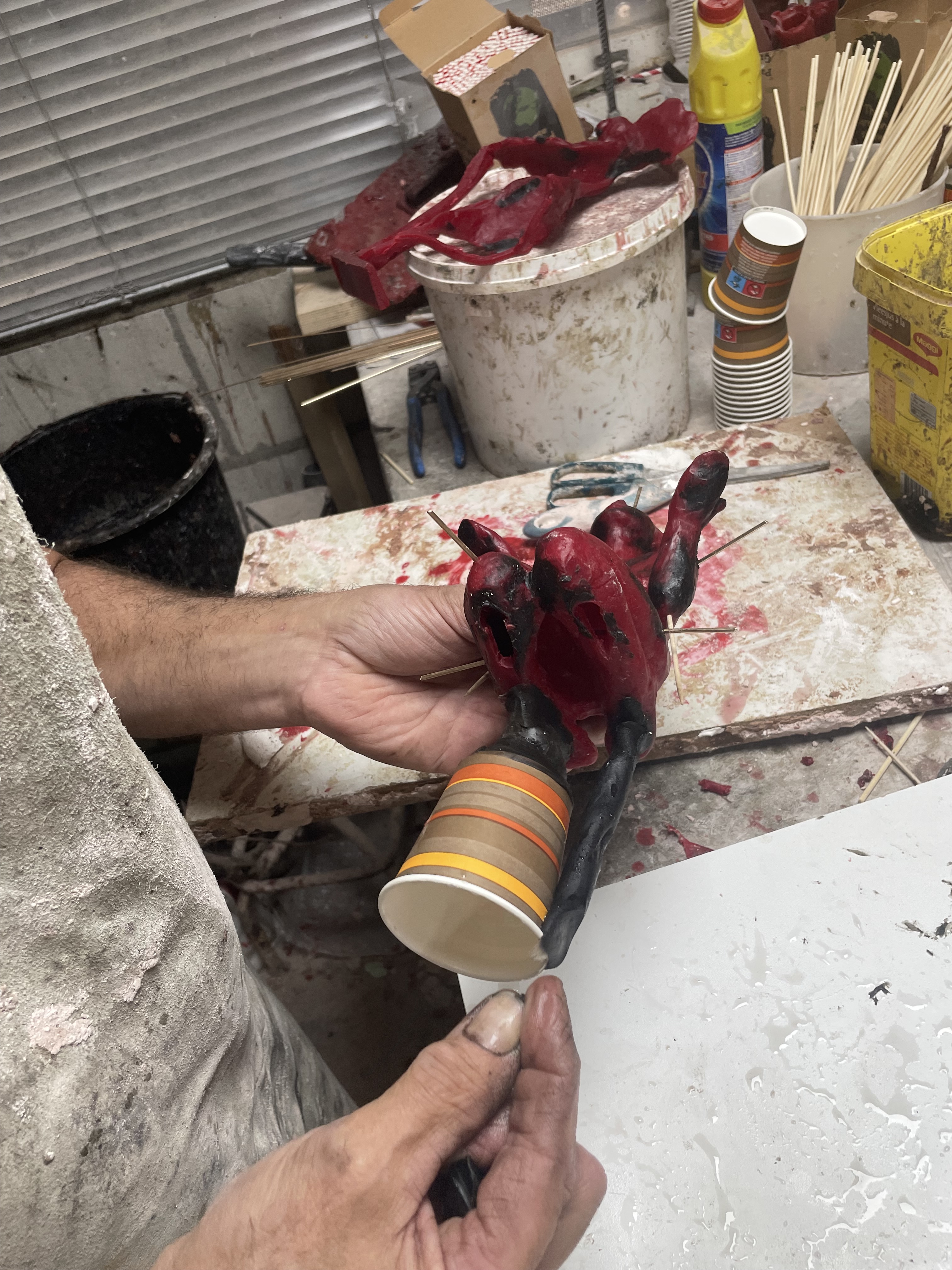 Beeld boetseren in was, mal maken van origineel in rubber, afgietsel maken in gietwas (rode kleur), gietkanalen aanbrengen, mal van gips maken, mal in de oven (verloren wasmethode), bronsgieter, afwerken, patineren, sokkel bevestigen: